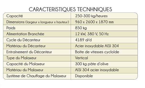 Il a une capacité maximale de traitement de pâte d’olive de 250kg par heure.